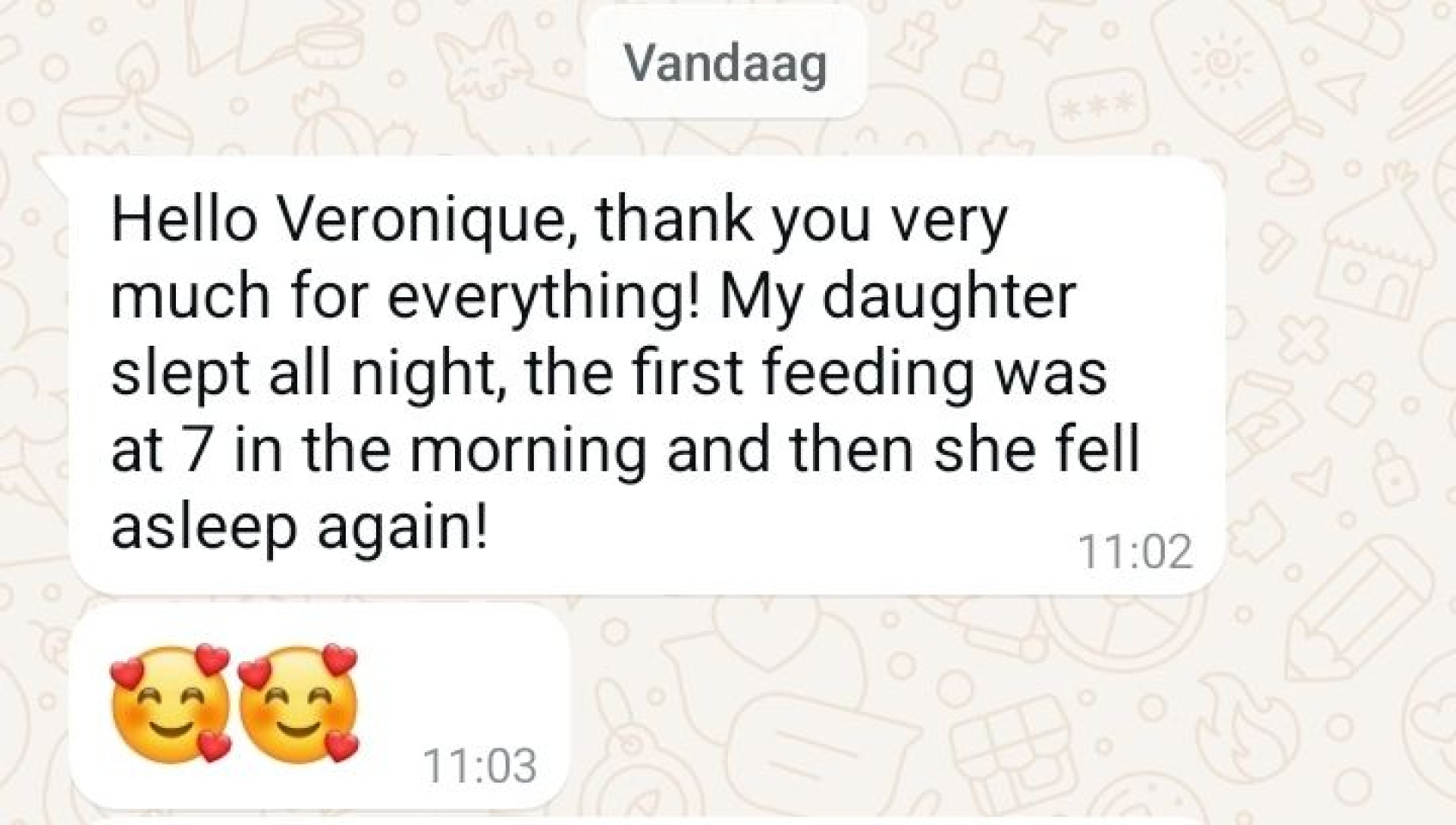 Ze ligt nog vredig te slapen. Ik kijk naar mama en glimlach. Ik kan de dankbaarheid zo van haar gezicht aflezen.